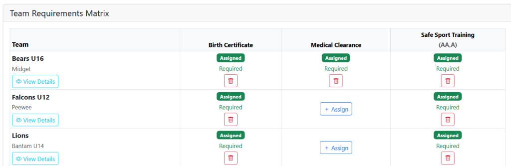 Not every team needs the same requirements — and BenchLocker gives you the flexibility to assign requirements based on team, age group, or special events.